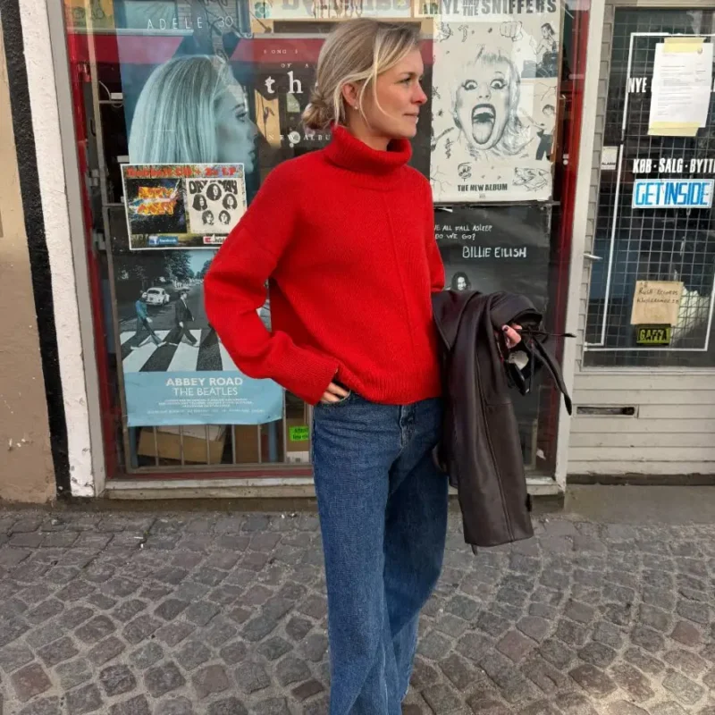 Pildilolev punane Scarlet Kampsun on kootud Sandnes Garn lõngaga Double Sunday värvitoonis 4018.